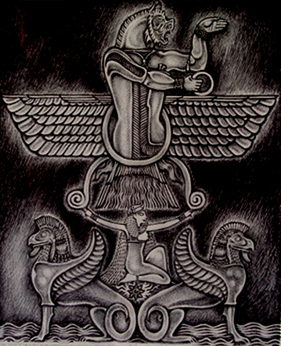 Here is a rendering of the 'anti-god' Ahriman that I completed about a year ago that I hope you folks will appreciate. In this particular illustration, I borrowed from Assyrian iconography to better illustrate the image...the ancient Mesopotamian war god Rhimmon, who at that remote period, seems to have represented to the Persians the most appropriate symbol of 'evil' than any other. Are the linguistic similarities of any significance? The anti-god here is depicted being supported by a foreign goddess, perhaps Druj, while flanked by two gryphins which are evocative of the Assyrian god, Nisroch. He is seen emerging from the winged disk, a long established representation of power and sovereignty throughout the region at that time. Ahriman, in contrast to those forces if Nature which evoke the phenomenon of 'What Is', represents and articulates the cosmic condition of all that 'Is Not'. The original Devil in humanity's historical iconography.
