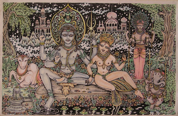 Isolated in oblivious solitude in His secret in the Himalayas, Lord Shive seated with his Vahana, Nanda the Bull, endeavored to perform His Tapanas...the sacred Meditations which produced within Him magnificent power, resplendent with energy and heat. This great potential, lying dormant within, alas took form in the manifestation of Kundalini, the Coiled Serpent, his Shakti. After much effort and with the help of the Divine, Shakti, in the visage of the goddess Parvati (daughter of Himavan, Lord of the Mountains) succeeded in utilizing her awesome powers of Tapana to thus awaken Shiva from His meditaiton in order to win his affection. On the banks of Lake Manasaravar in the Kalais Mountians, the couple enjoyed married life. From this union were born their divine offspring. From the icy waters of the River Ganges came forth Kartikeya (Skanda), the celestial warrior. But, strongly enough, it was Ganesha whom Shiva accepted as the first of his sons...who had become the elephant headed guardian of the threshold, the sacred doorkeeper which became the obstacle to all that is undesirable. Ganesha also became known as the patron of The arts, Sciences and Wisdom...symbalic of Good Fortune. He is also often accompanied by the mouse (Mooshika) believed to be his Vahana (sacred vehicle), but this seems to have been the case only after the 7th century C.E. The union of Shiva and Parvati, as well as their subsequent family structure, might be interpreted in many ways. The realization of the Consciousness in communion with the Kundalini as it defined in Tantric terminology. Most commonly, however, this state of martial bliss between metaphysical Hermeticism and worldly devotion demonstrates the harmony between Matter and Spirit.