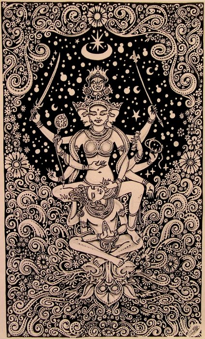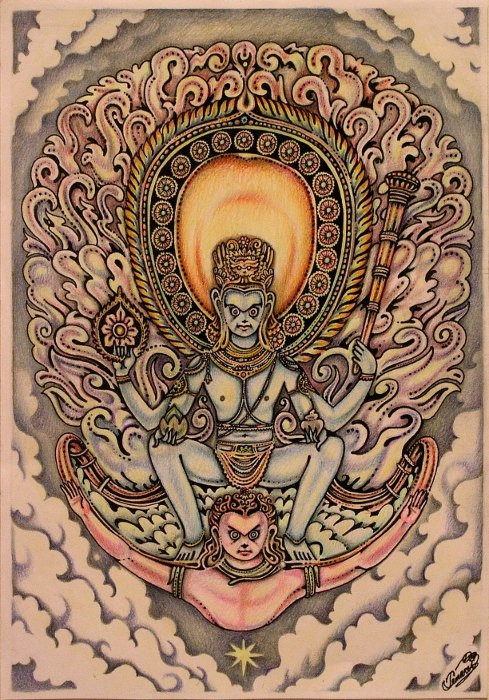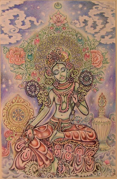 Evocative of 'the energy in space', Khandroma (Hindu Dakini) is the avatar of 'Sky' or 'Void', the insubstantiality of the totality of phenomonae which simultaneously propagate(s) the absolute of all potential manifestations (Sunyata).