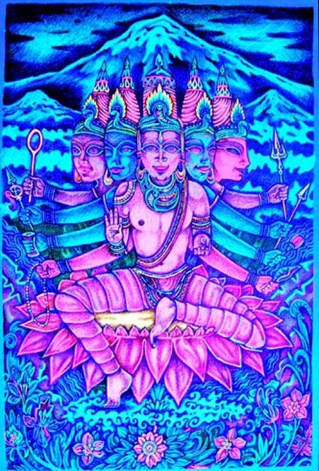 Brahma is the first personality of the Hindu trinity with Vishnu and Shiva. He is essentially a creative force, father of god-forms and all sentient beings. Transcending Space and Time, the world universe is manifest darkness,...unknowable, shapeless, absolutely without form, sleeping.