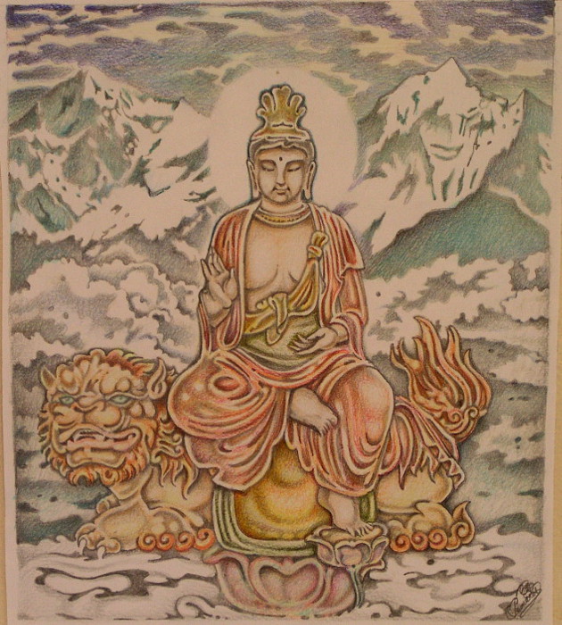 Inspired by a 9th century work of the T'ang period from Bezeklik, Chinese Turkestan. The abstract linear style, however, is reminiscent of the Northern Wei Dynasty which resembles the Romanesque of Europe, but is most commonly found in the sculptures rendered by pious craftsmen and monks which decorate the cave sites at Yun-Kang and Lung-men. The intricate design on the halo is characteristic of works from the mid 5th century Mathura Gupta period.