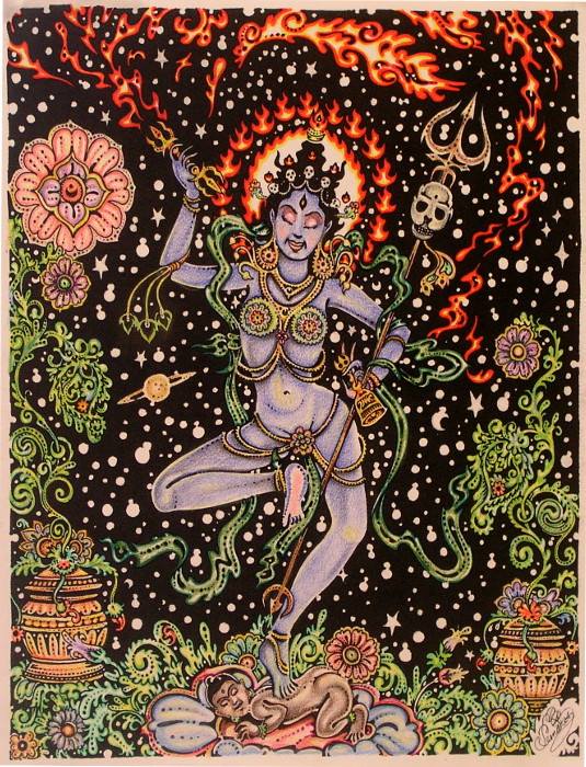 Here, we may be inspired to contemplate Her appearance as one of the seven flickering tongues of the fire god, Agni...alas, the Black Flame of Enlightenment which illuminates from within. A 'meditational' figurehead in the form of the Divine Feminine.Art by Zap Tripper