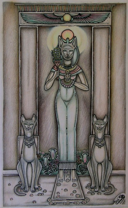who assisted Him in forming the universe. When Tehuti, in the form of Tekh, created the universe, He was assisted by those who came from the watery mass, the Eye of RE. As wife of Ptah, in the city of the White Wall, Men-Nefer, She was reckoned the mother of Nefertum and also of the deified vizier/architect, Imhotep, to whom was attributed the creation of Zoser’s Step Pyramid. Besides being identified as a goddess of war and pestilence , She was also understood as a goddess of healing in Her more gentle incarnation as Bastet. In very late times, pilgrims visited Her temples and those of Imhotep for their reputation as sanctuaries for the ill. Various titles of the goddess imply that She was of Libyan origin and that at a very early period , She was worshiped by the people of the Northwest Delta. Her iconography suggest strong similarities with other foreign goddesses, some who occasionally were also worshiped in the Delta region. Goddesses such as Astoreth may have shared several distinct qualities with Her rendering them more acceptable to the Egyptian as was probably the case with other deities like Neith and Anat, Set and Baal. |