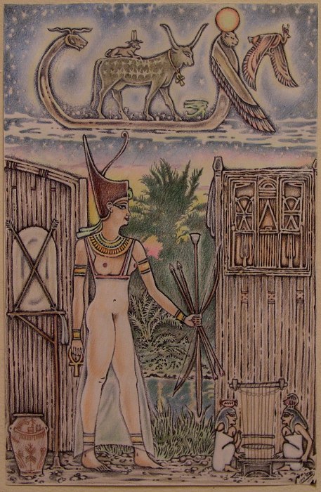 AMUN (AMON):As is stated in my vignette of Amunet, Amun was one of Eight primordial deities in the Hermopolitan Ogdoad presided over by a ninth, the lunar god Djehuti. They were the gods that presided in the dark chaos at the beginning of time itself, the germs of all living things. To the ancient Egyptians,this was a great mystery better understood through the heart (or conscience) than with the objective mind. What is most obscure and ironic is that Amun, 'the hidden,' should by the twelfth dynasty, somehow emerge from his own shadowy history and onto the great monuments of the Middle Kingdom. Again in the New Kingdom, he fused with and into the Heliopolan solar deity RE... to form Amun-RE. The once mysterious god so unknowable manifested into the celebrated all prevaiding Creator in the age of Egypt's seventeenth dynasty 'Empire.' |