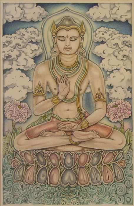 Evocative of 'the energy in space', Khandroma (Hindu Dakini) is the avatar of 'Sky' or 'Void', the insubstantiality of the totality of phenomonae which simultaneously propagate(s) the absolute of all potential manifestations (Sunyata). Consequentially, Khandroma embodies the concept of the path of Transformation wherein such the flow of energy is associated with 'The Greater Tantra'. In this context, the energy of negative emotions is transformed into the illuminating awareness of non-dual consciousness. In this distinctive illustration, Khandroma/Dakini is depicted clarifying certain aspects idiosyncratic of the goddess, Kali. In Her right hand She wields the Vajra thunder-bolt. Beneath Her lies the calm and prostrate Shiva, upon whose body She dances, conducive to the rhythm of Time Eternal. In this regard, She is the Divine Protectress, the Bestower of 'Moksha', that is, Liberation. Here, we may be inspired to contemplate Her appearance as one of the seven flickering tongues of the fire god, Agni...alas, the Black Flame of Enlightenment which illuminates from within. A 'meditational' figurehead in the form of the Divine Feminine. Art by Zap Tripper Photography by Kali Karnivora Medium: Sharpie marker, Penmark, Micron, colored pencil and graphite on 20 lbs. bond paper. Hope you all diggit! |