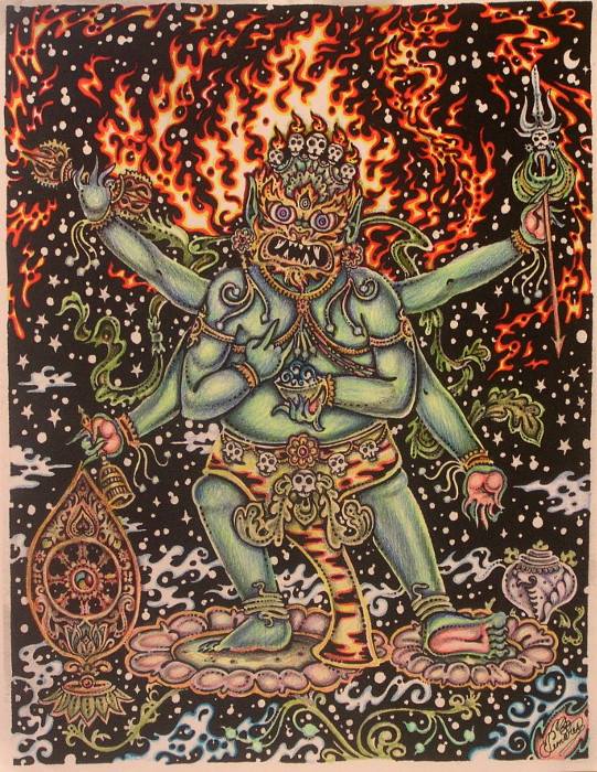 | 'Mahakala Paramashiva', consort of Kali...'The Boundless One', guardian of Dharma. Medium: Sharpie marker, graphite, colored ink and pencil on 20 lbs. print paper. Art by Zap Tripper Photography by Kali Karnivora |